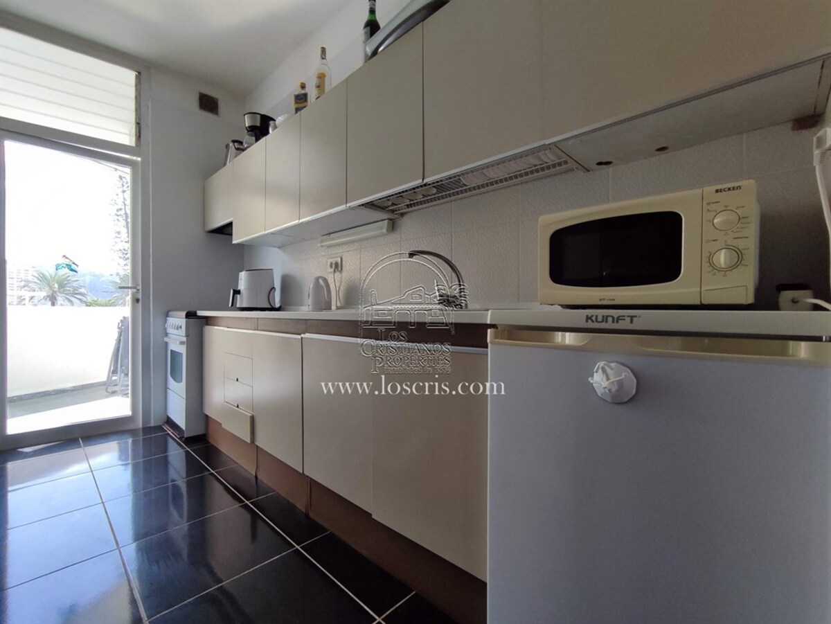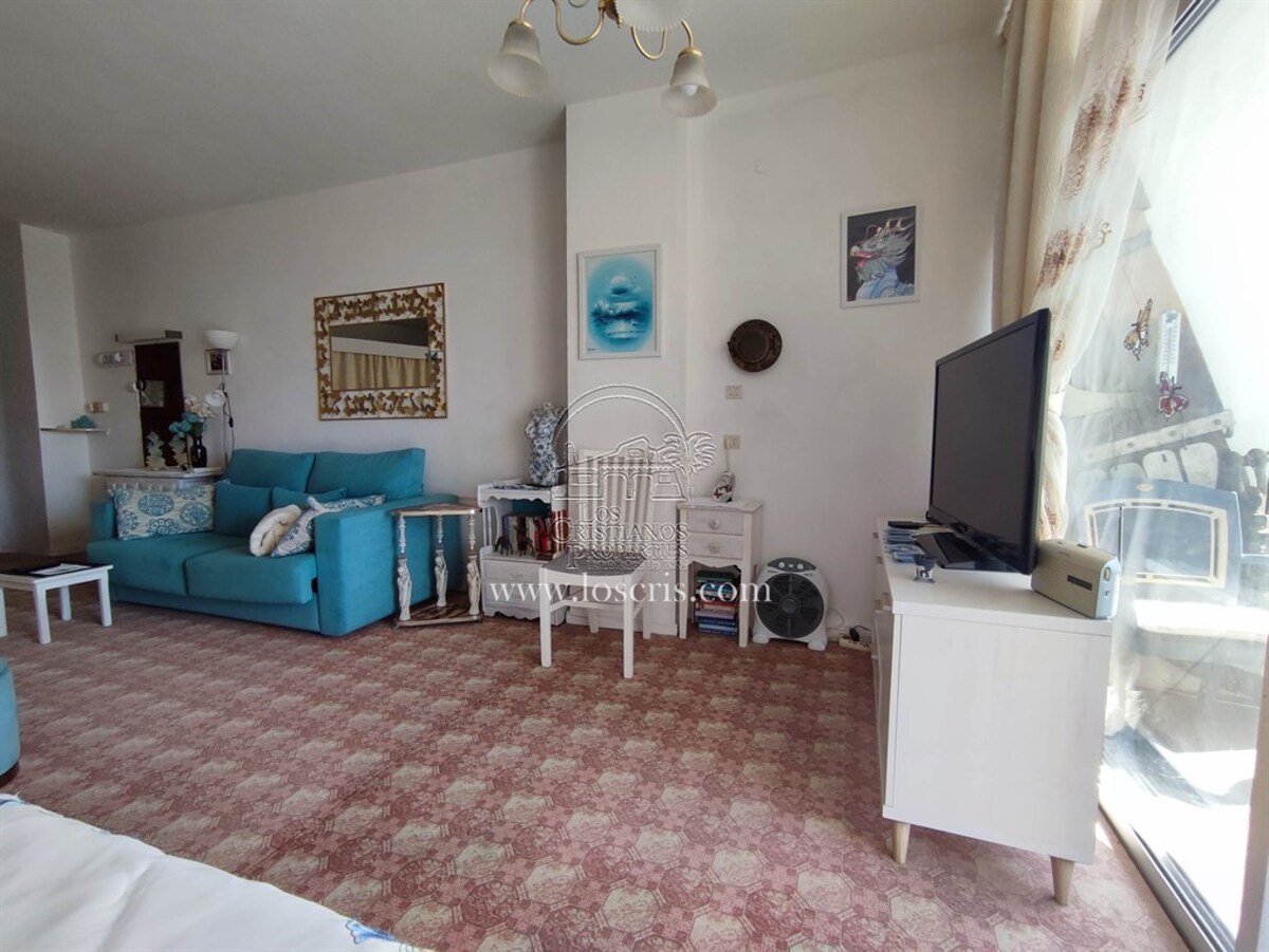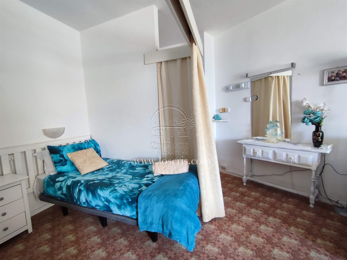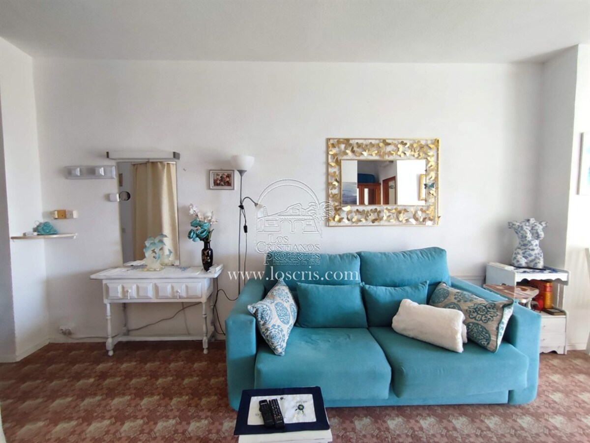 Studio-type apartment situated on the ground floor of a front-line complex in Los Cristianos. The studio is situated on the side of the complex, with an interior measurement of approx. 39,62 m² and comprises a bathroom and a separate kitchen leading onto the lounge/bedroom area. The sleeping area is partitioned off to give privacy from the rest of the lounge. The terrace measures approx. 11.85 m² and offers great sea views. The studio is sold fully furnished. This is a sought after complex, with alll ammentites close by and communal parking is available inside the complex accessed by remote control. There is a swimming pool on the complex and a sunbathing area.