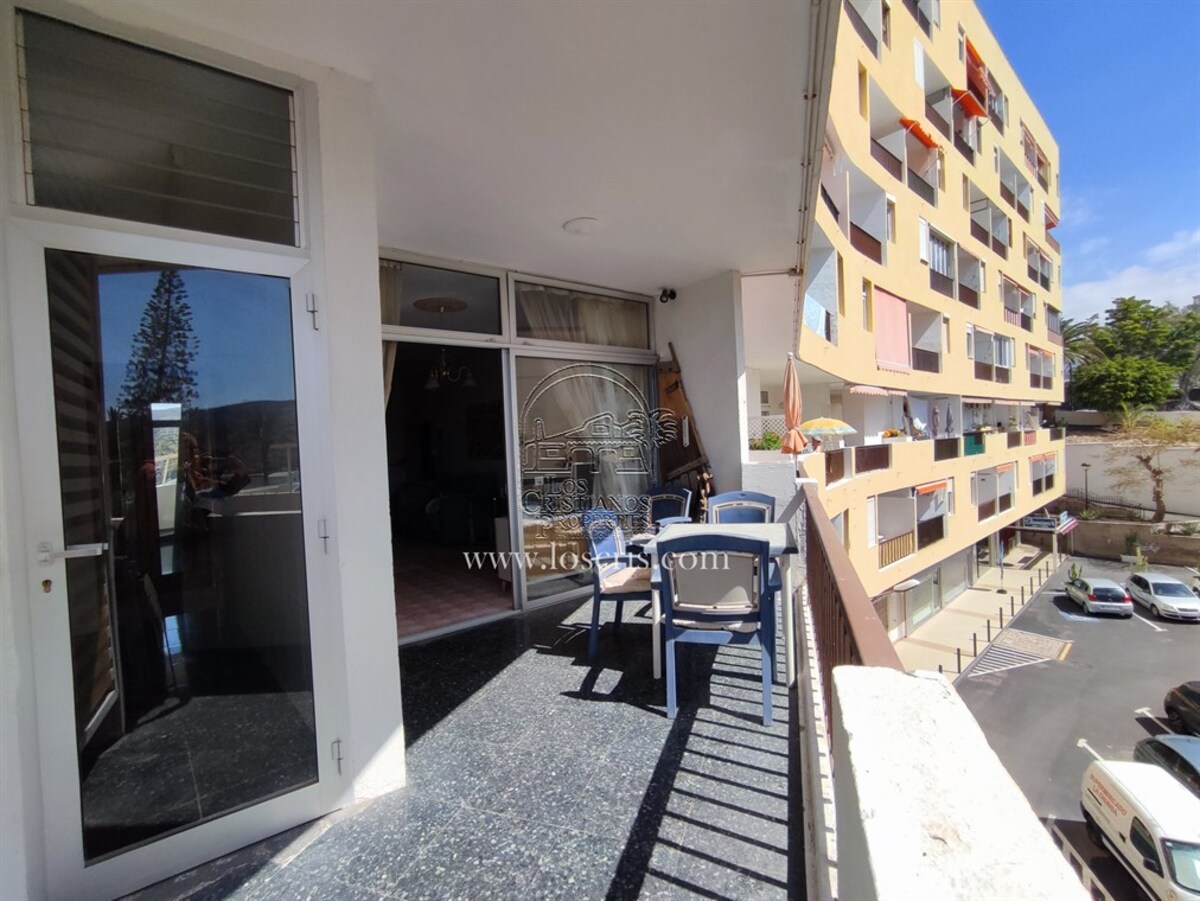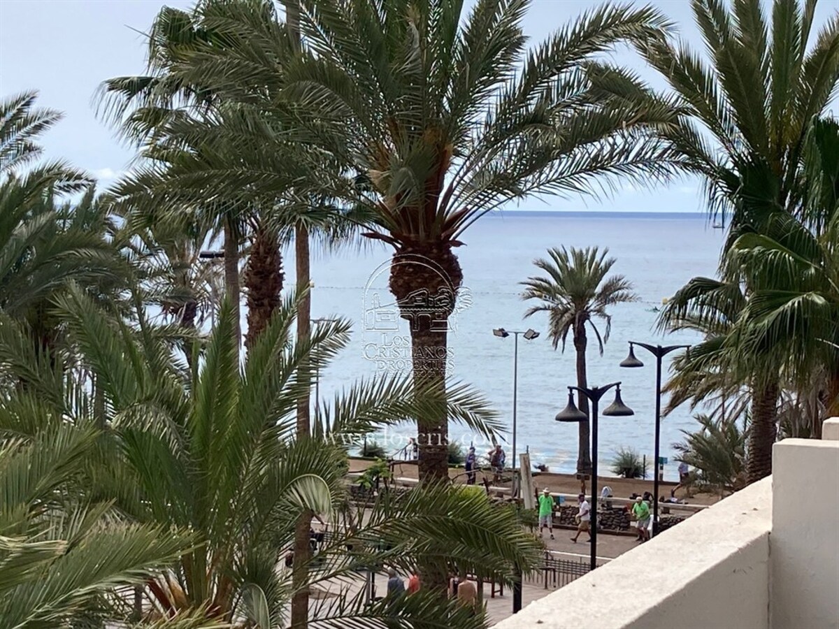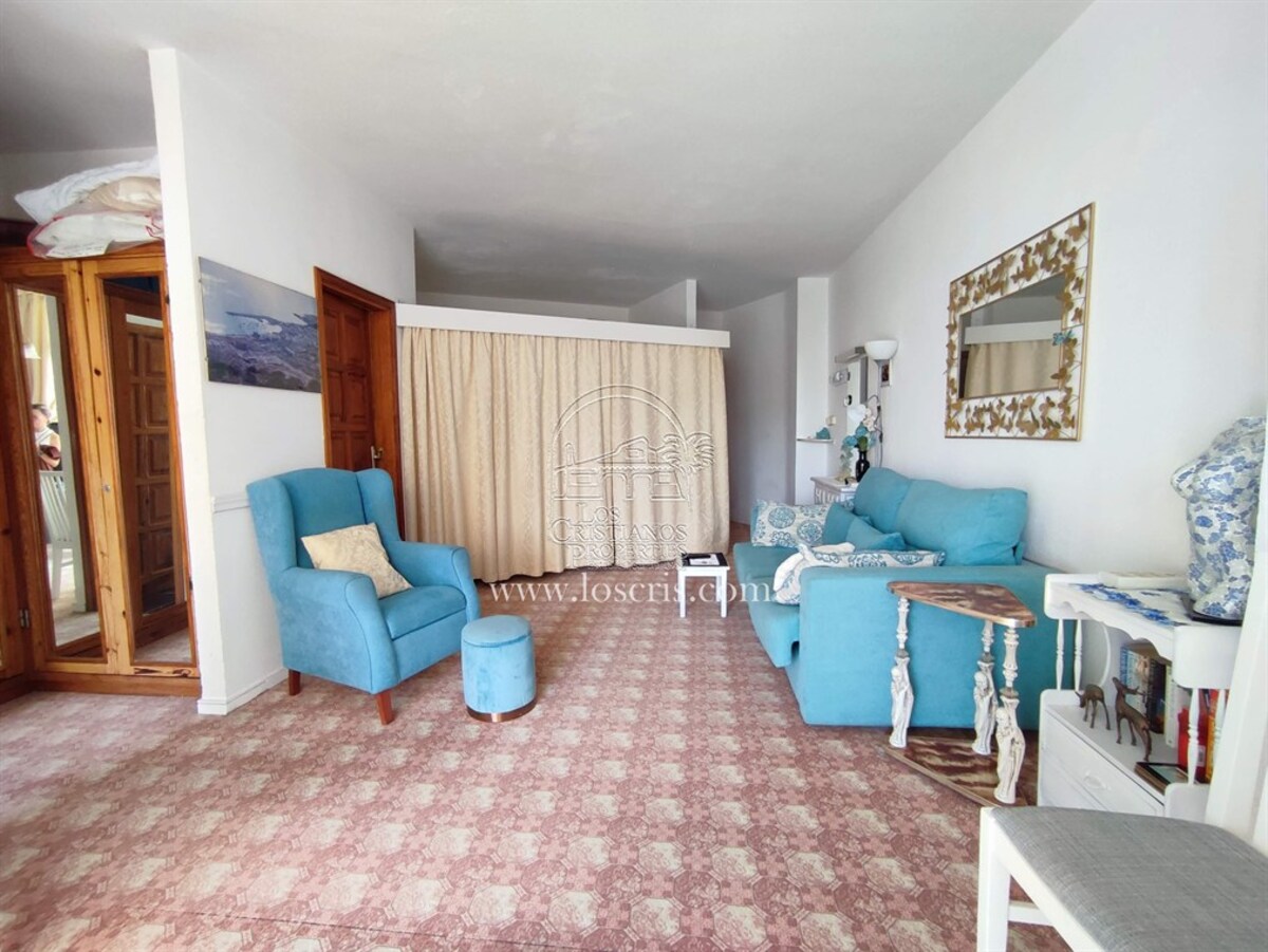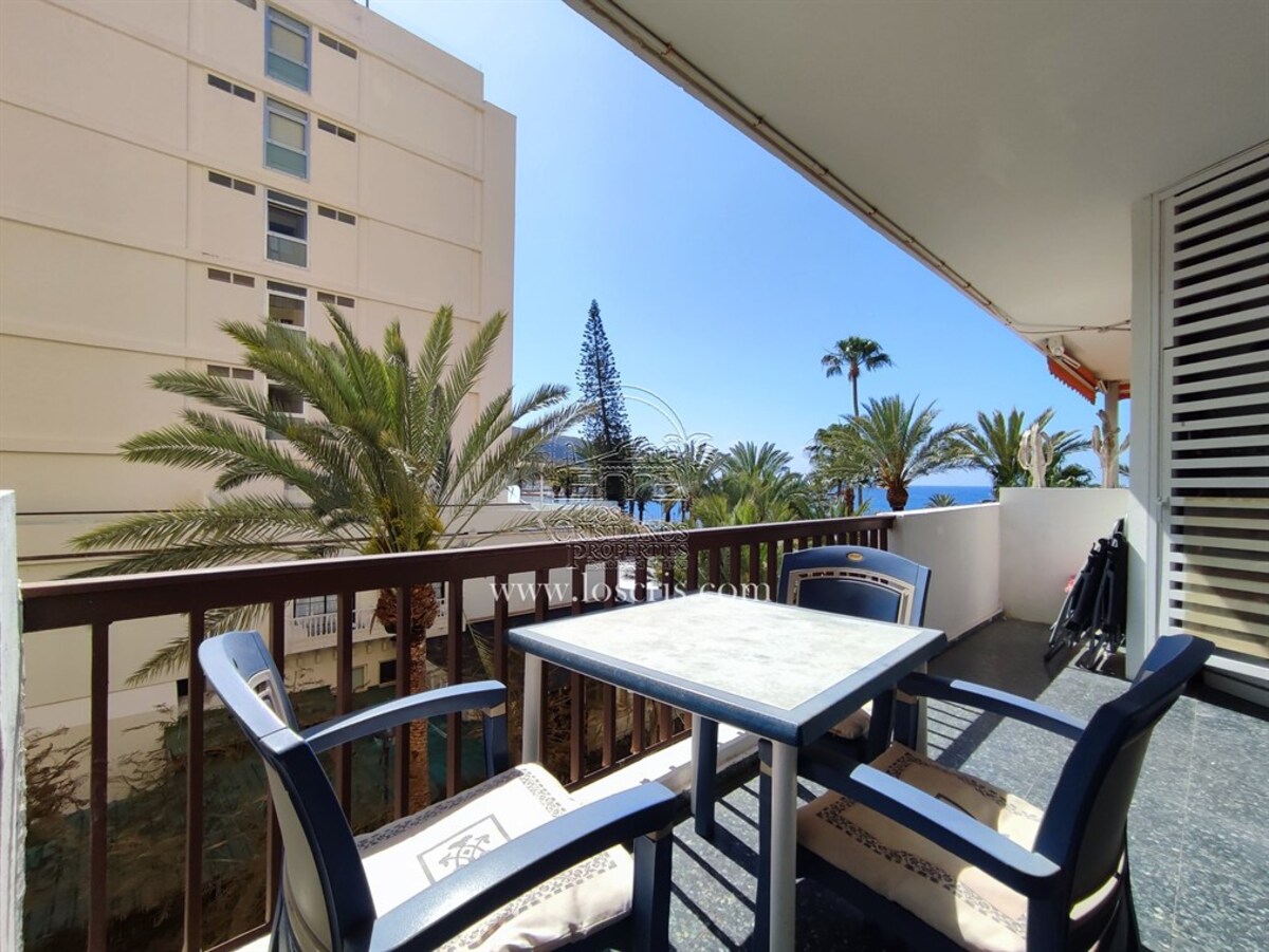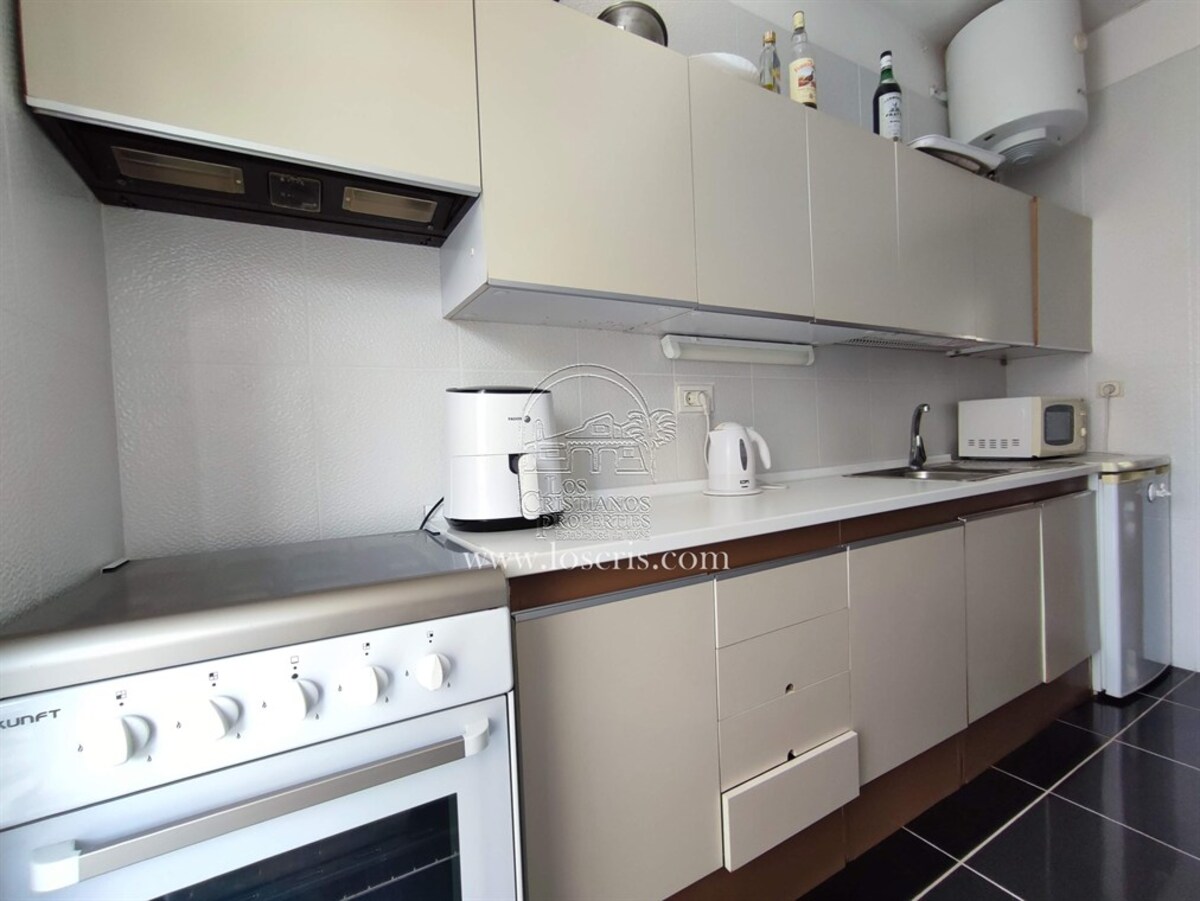 Studio-type apartment situated on the ground floor of a front-line complex in Los Cristianos. The studio is situated on the side of the complex, with an interior measurement of approx. 39,62 m² and comprises a bathroom and a separate kitchen leading onto the lounge/bedroom area. The sleeping area is partitioned off to give privacy from the rest of the lounge. The terrace measures approx. 11.85 m² and offers great sea views. The studio is sold fully furnished. This is a sought after complex, with alll ammentites close by and communal parking is available inside the complex accessed by remote control. There is a swimming pool on the complex and a sunbathing area.