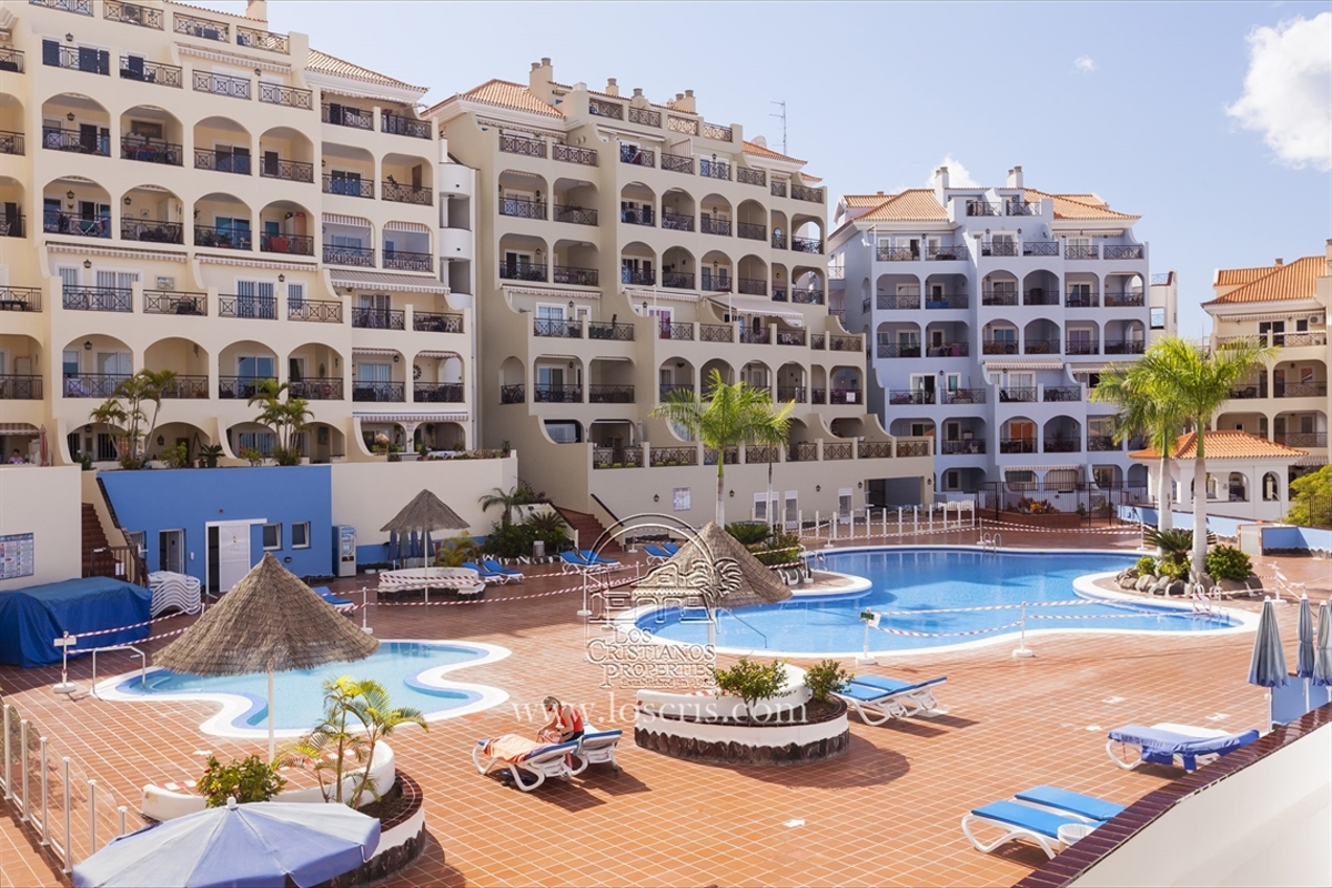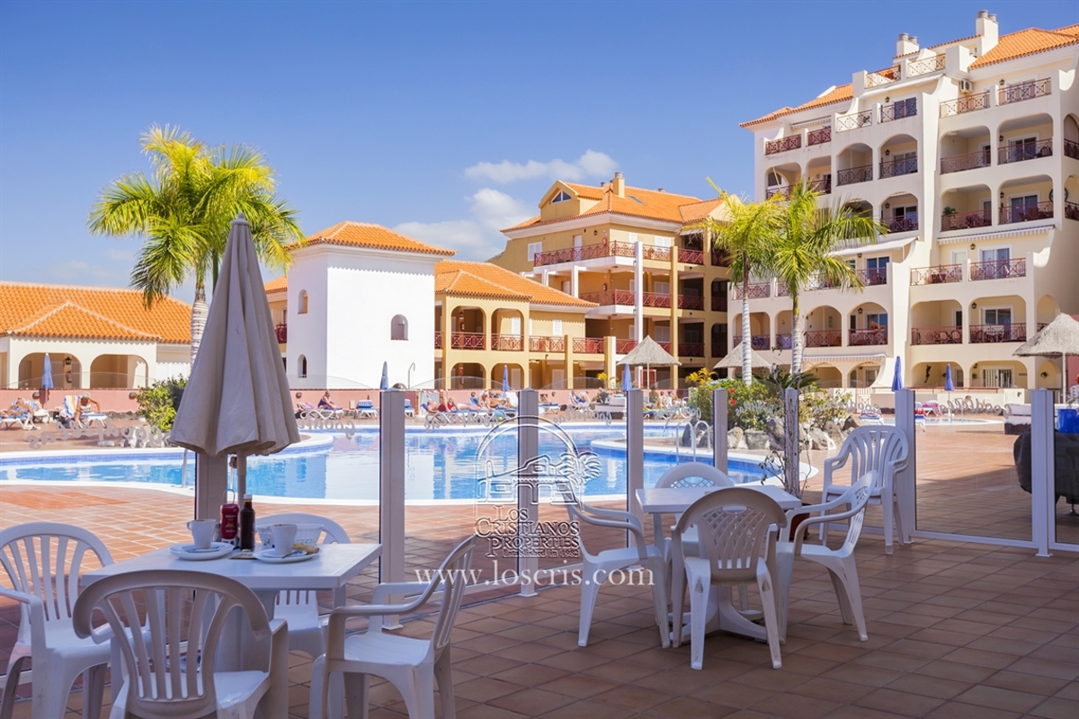 A spacious one bedroomed apartment on the ground floor. This property is suitable for wheelchair users the bathroom has been converted to an open shower. New modern kitchen made completely open plan giving easy maneuverability. Large terrace with covered roof accessed through patio doors from the lounge giving space for dining outside, a further spacious terrace with sun loungers to enjoy afternoon sun.The complex has a heated pool with a popular bar which is accessed via lifts and there are ramps around the complex.
