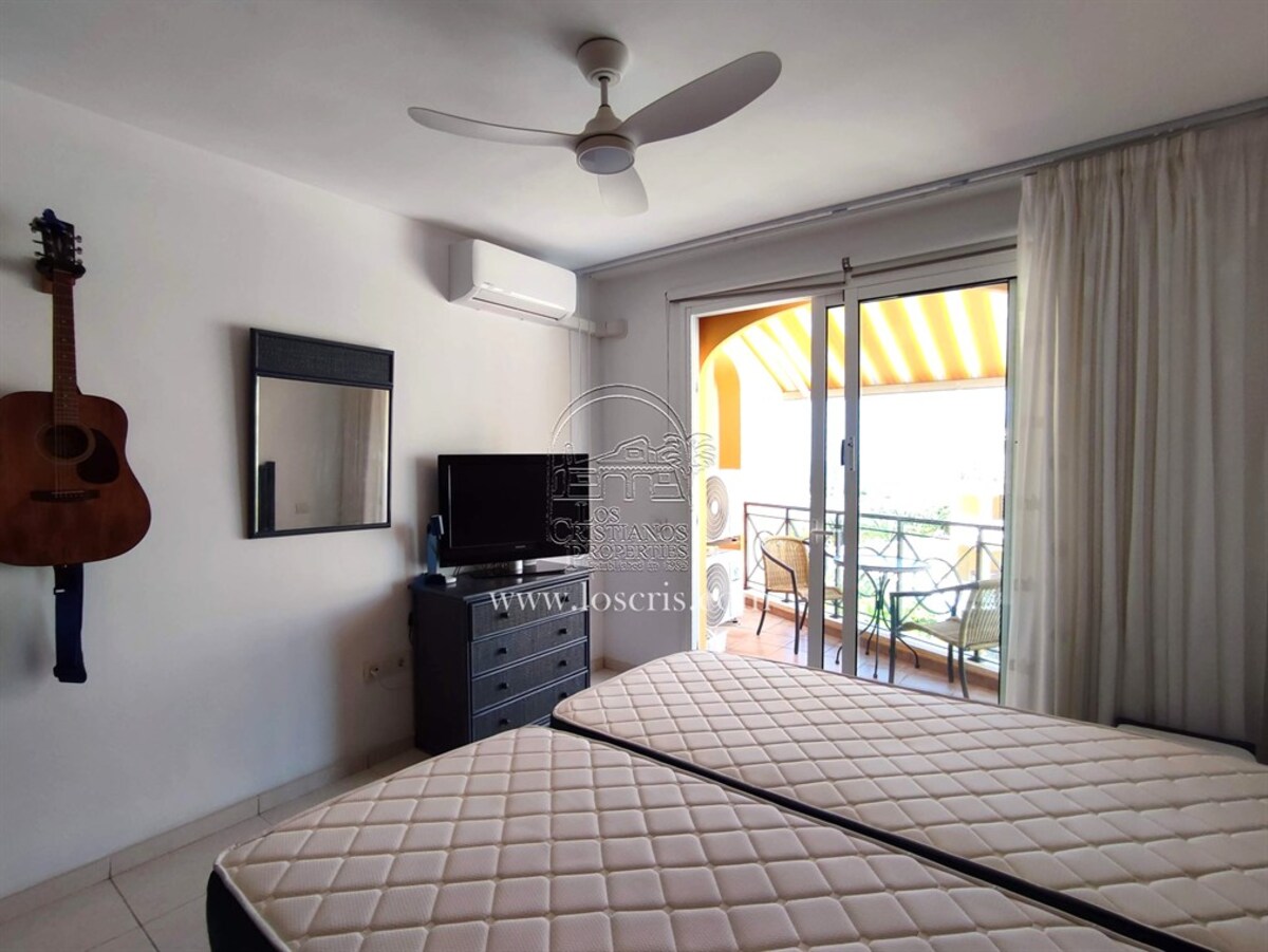 1 bedroom 2nd floor apartment on the sought after complex Parque Tropical 2 , bedroom with fitted wardrobes , patio doors onto an open terrace with afternoon sun and pool views. Family bathroom, american style fully fitted kitchen, lounge with patio doors to a covered terrace with glass folding windows, distant views to the sea.The property is being sold furnished with 2 sofa beds, water filter, remote control sun blind, air condtioning in the lounge and bedroom.