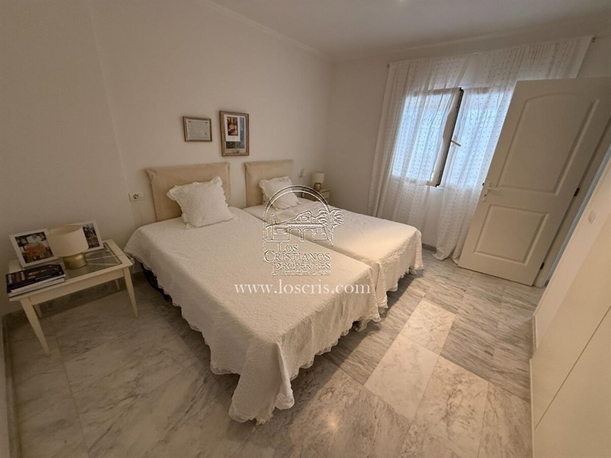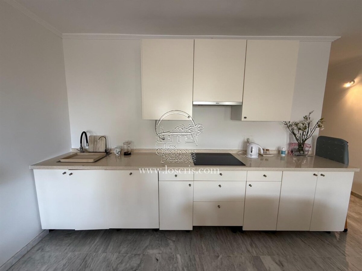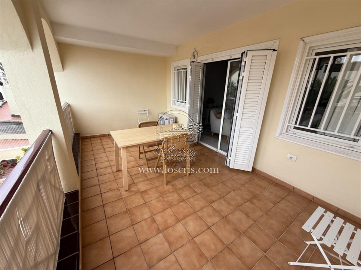 Well maintained 1st floor apartment on a sought after complex in Los Cristianos. One bedroom with fitted wardrobes, shower-room, storage cupboard with washing machine , new fully fitted kitchen, lounge with sofa bed ,dining area with patio doors leading to a spacious covered terrace with street views. Sold fully furnished with quality fixtures and fittings.The complex has a heated pool and each owner is allocated 2 sunbeds and 1 umberella.