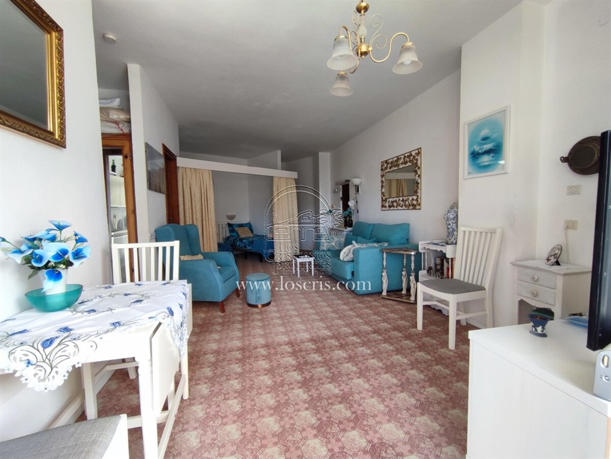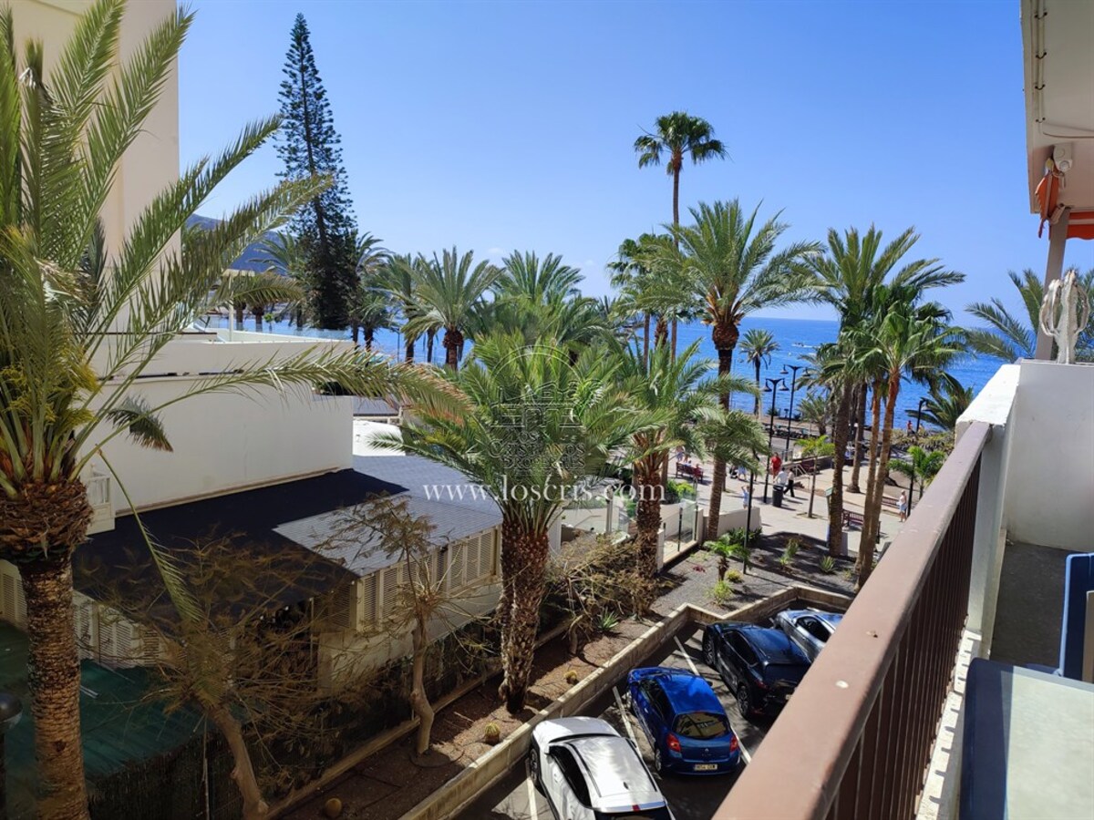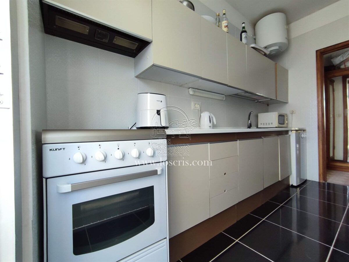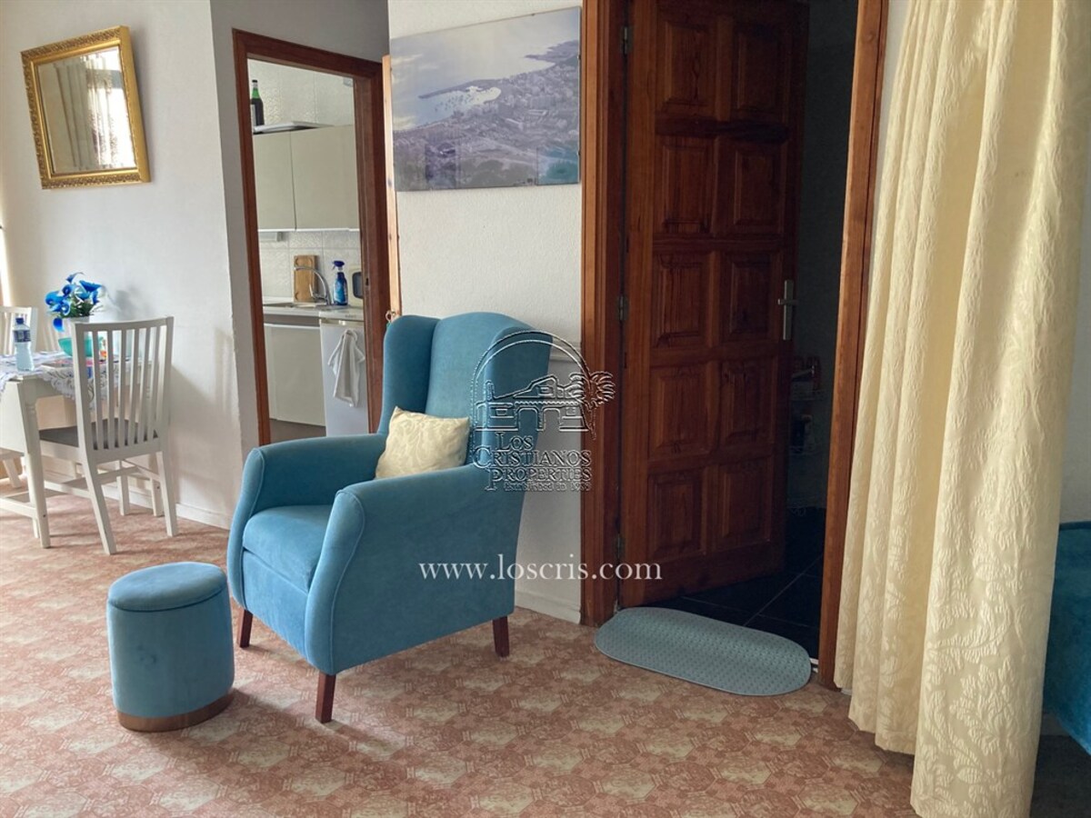 Studio-type apartment situated on the ground floor of a front-line complex in Los Cristianos. The studio is situated on the side of the complex, with an interior measurement of approx. 39,62 m² and comprises a bathroom and a separate kitchen leading onto the lounge/bedroom area. The sleeping area is partitioned off to give privacy from the rest of the lounge. The terrace measures approx. 11.85 m² and offers great sea views. The studio is sold fully furnished. This is a sought after complex, with alll ammentites close by and communal parking is available inside the complex accessed by remote control. There is a swimming pool on the complex and a sunbathing area.