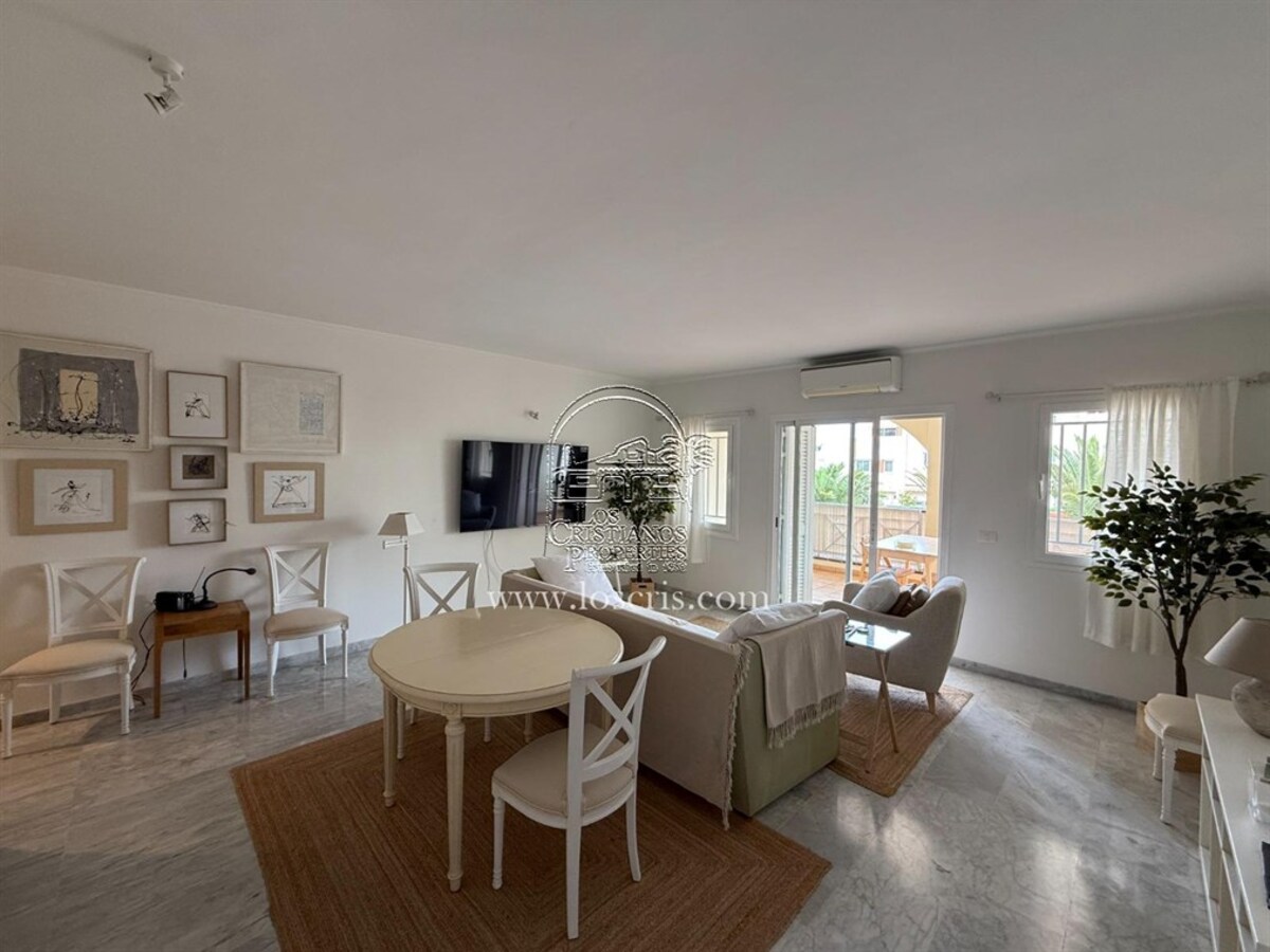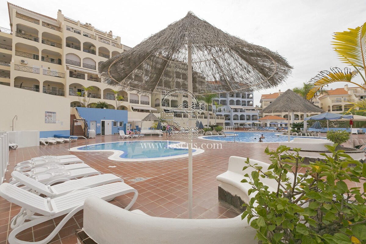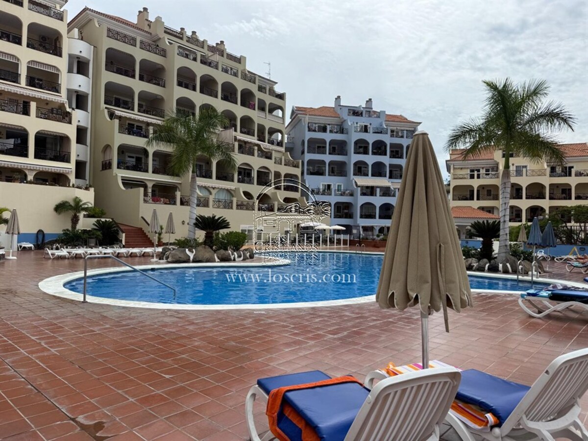 Well maintained 1st floor apartment on a sought after complex in Los Cristianos. One bedroom with fitted wardrobes, shower-room, storage cupboard with washing machine , new fully fitted kitchen, lounge with sofa bed ,dining area with patio doors leading to a spacious covered terrace with street views. Sold fully furnished with quality fixtures and fittings.The complex has a heated pool and each owner is allocated 2 sunbeds and 1 umberella.